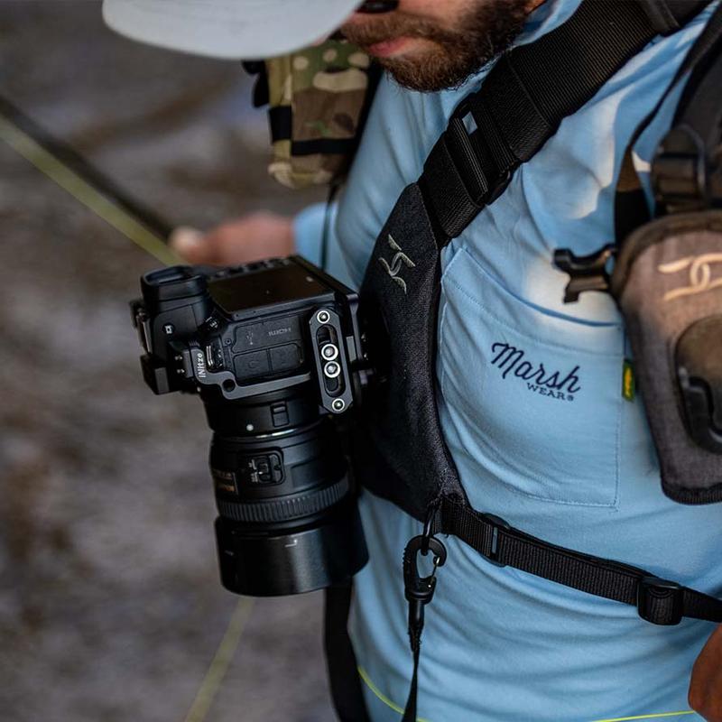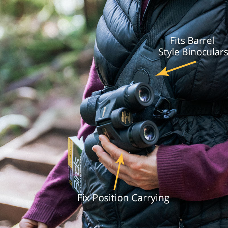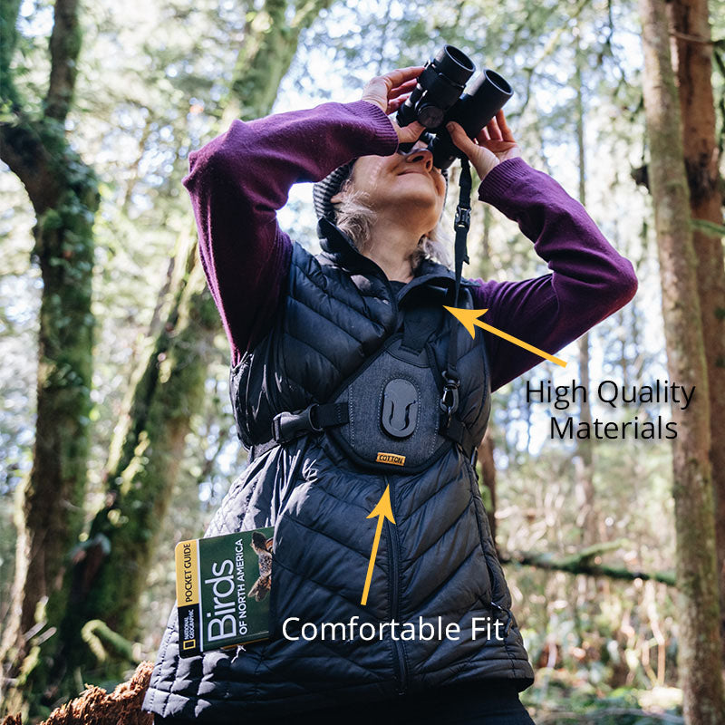 SKOUT is the world's most comfortable, safe and affordable camera or binocular harness. SKOUT holds your binoculars close to your body. Nothing moves. For active people: SKOUT is ergonomically designed to fit your body. Comfortable and snug. Your equipment can be deployed instantly and silently. The advantage of the SKOUT harness is its fixed-position carrying system. Our patented Twist & Lock mount secures your binoculars to your chest. SKOUT offers great stability and weight distribution, while keeping your optics accessible.