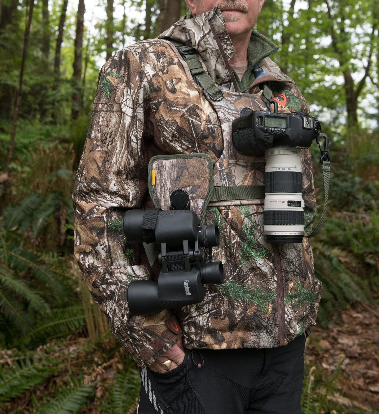 Secure your larger lens via the lens foot on your lens to assure maximum comfort. The harness also fits comfortably under a backpack.