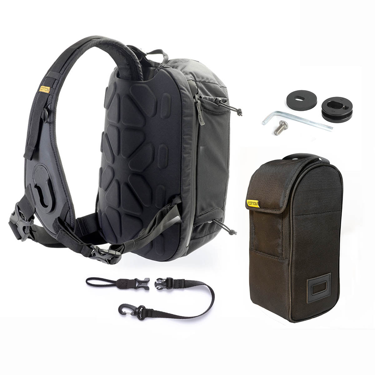 Jetzt vorbestellen!Der Hyker Slingbag für eine Kamera umfasst unsere Aluminium-Kamera-Hub und eine Kamera-Montage-Hardware sowie einen Schnellverschluss-Tether-Riemen. Enthält auch die Einfügungskoffer mit 3 beweglichen Trennwänden.