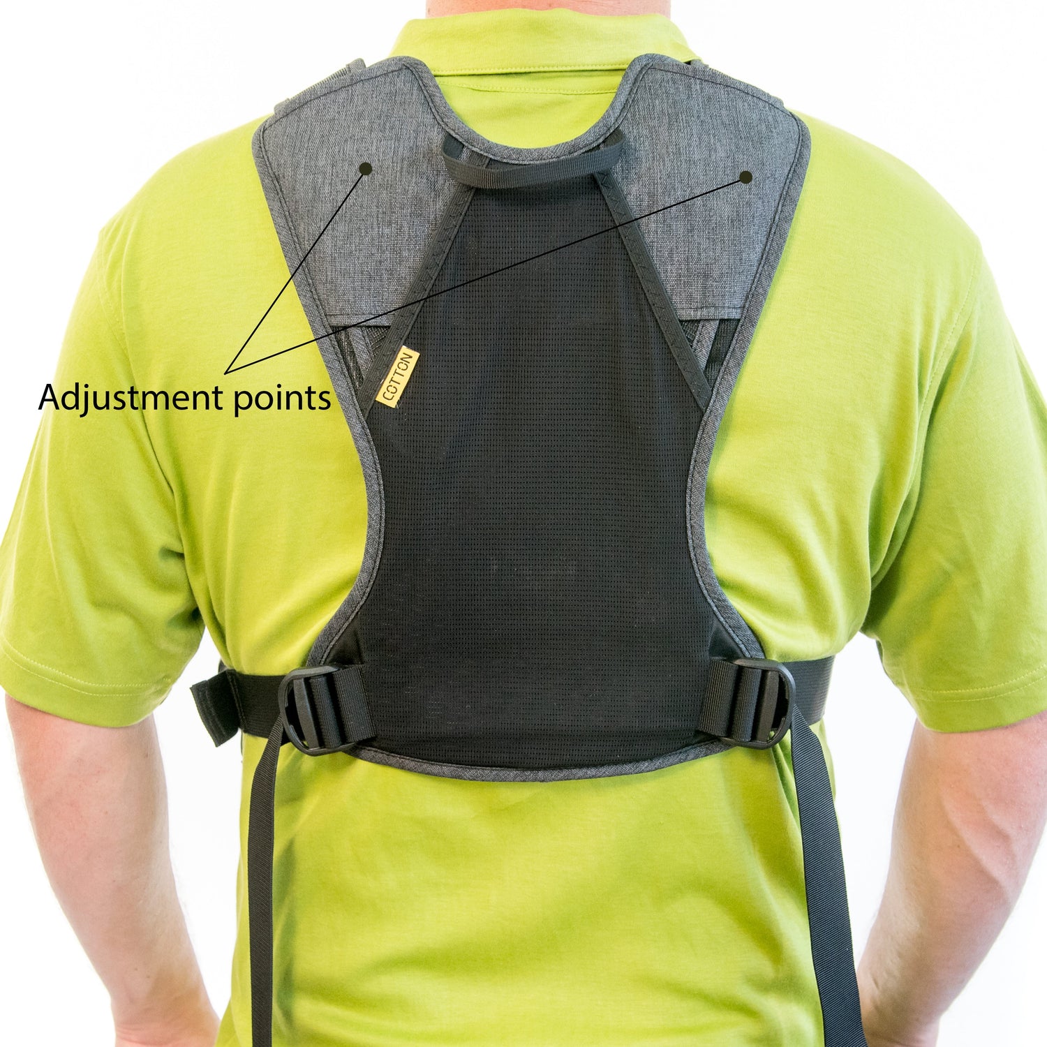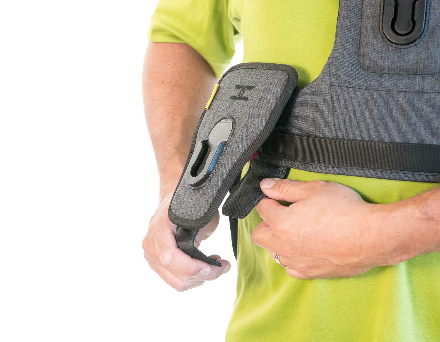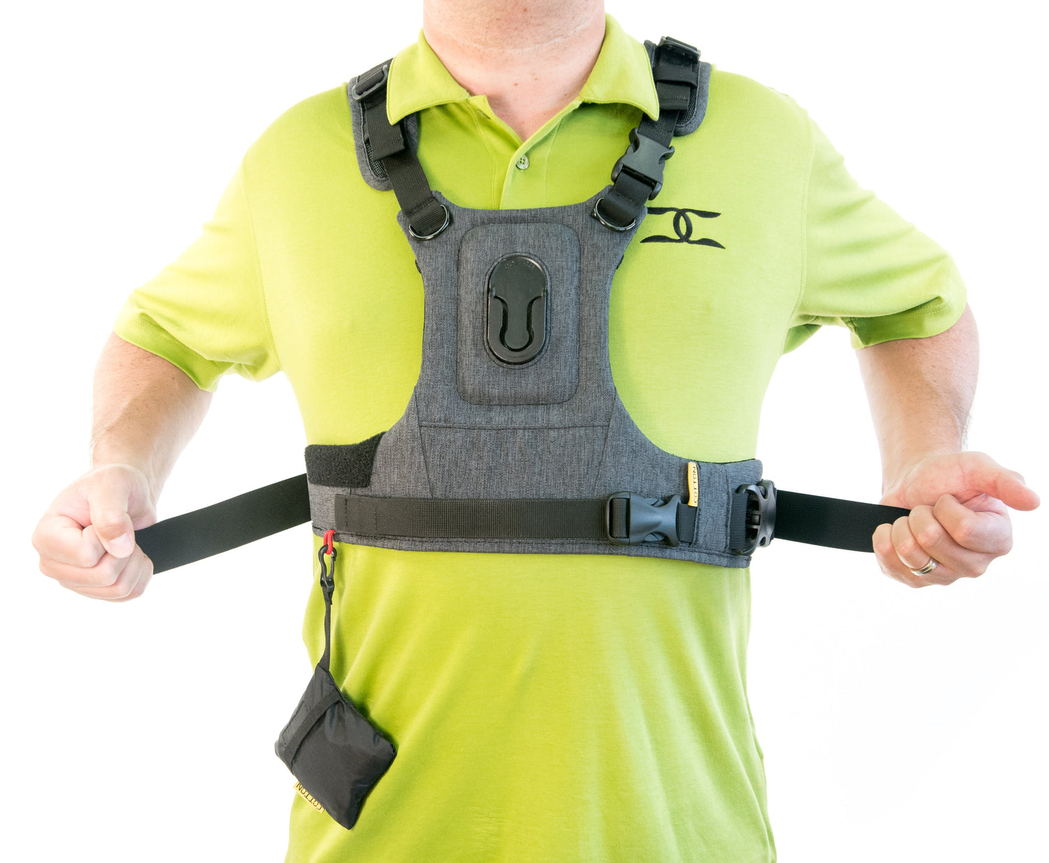 6. Adjunte la funda lateral a su arnés usando las envolturas de velcro como se muestra aquí. Si se prefiere, también puede conectar la funda a su cinturón o a la correa de la cintura de su mochila.