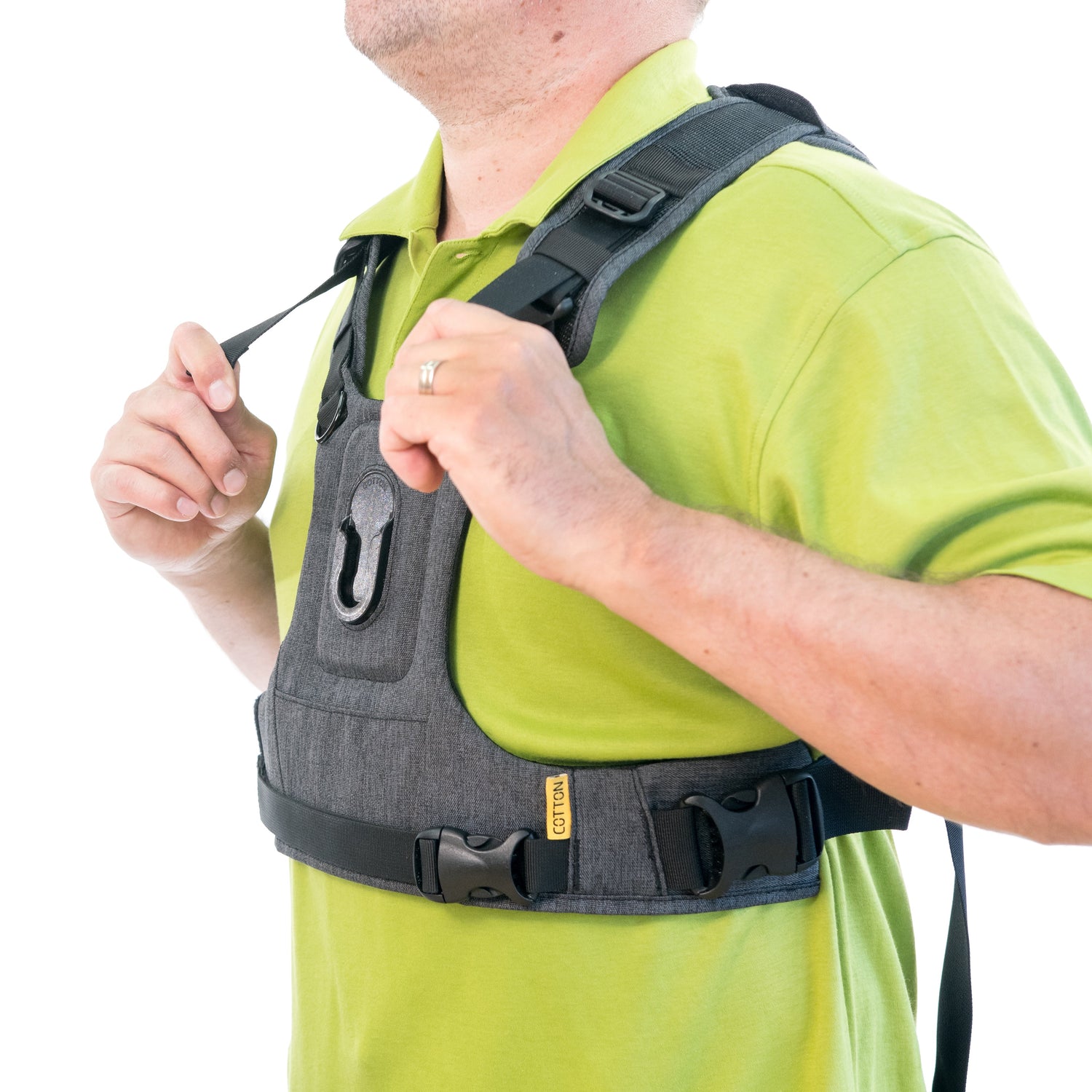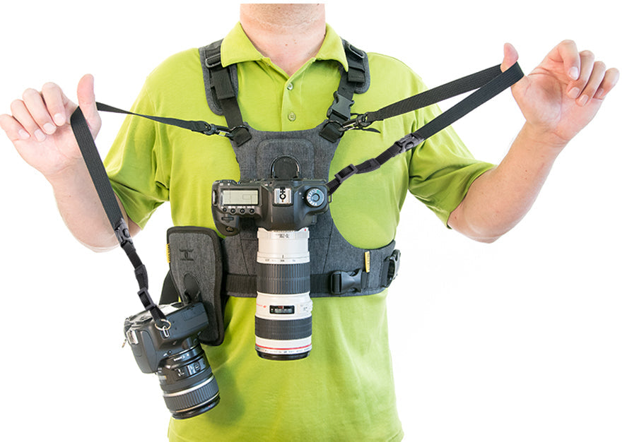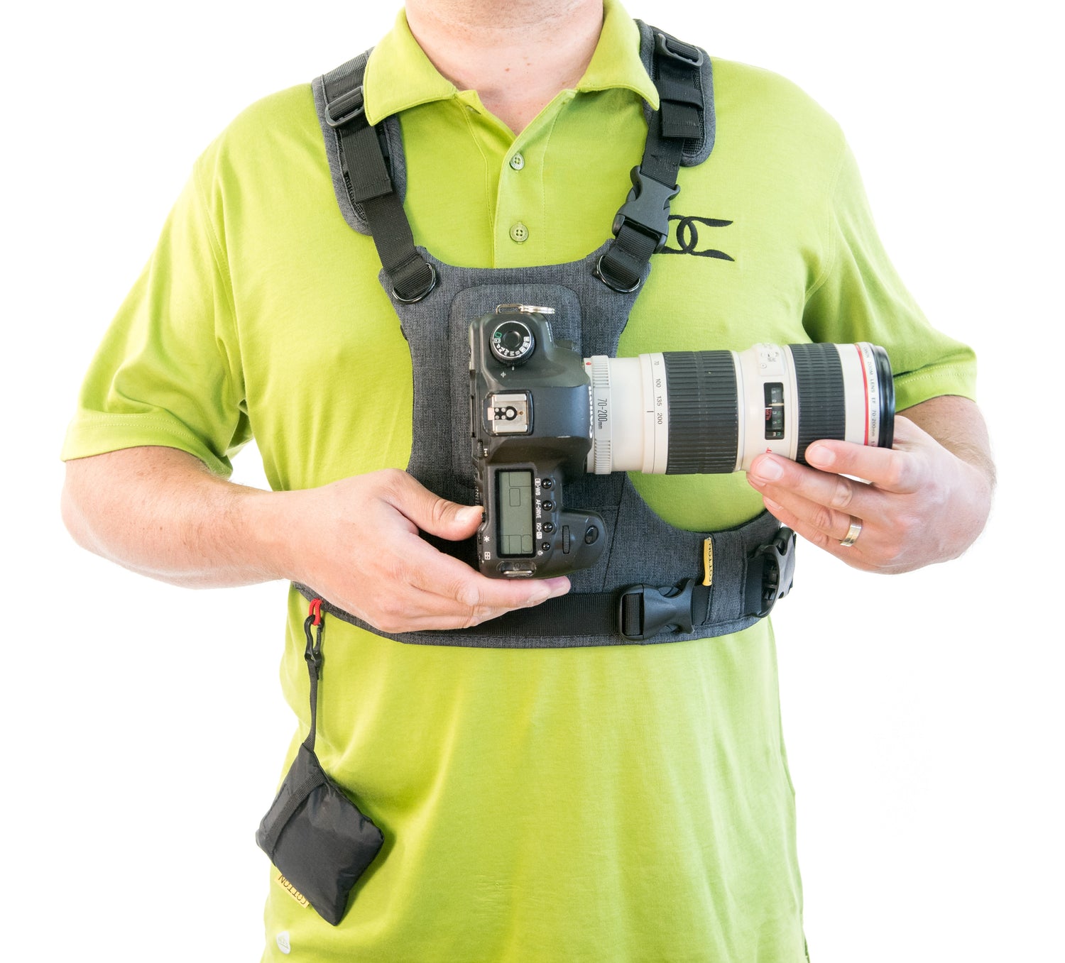 7. Para mayor seguridad, adjunte los ataduras utilizando los anillos D en su arnés y los ojales en su cámara.