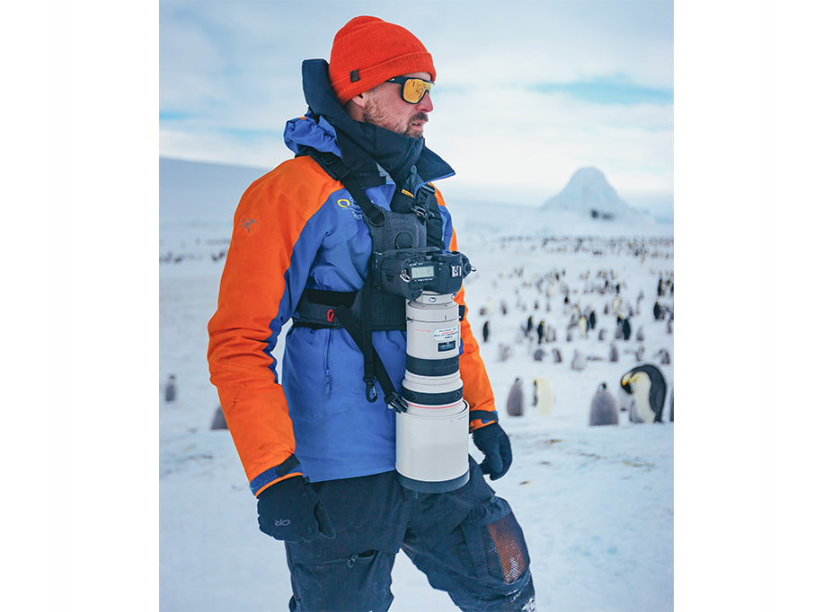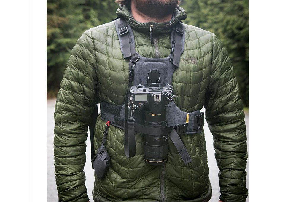 Sécurisez votre plus grand objectif via le pied de l'objectif sur votre objectif pour assurer un maximum de confort. Le harnais s'adapte également confortablement sous un sac à dos.