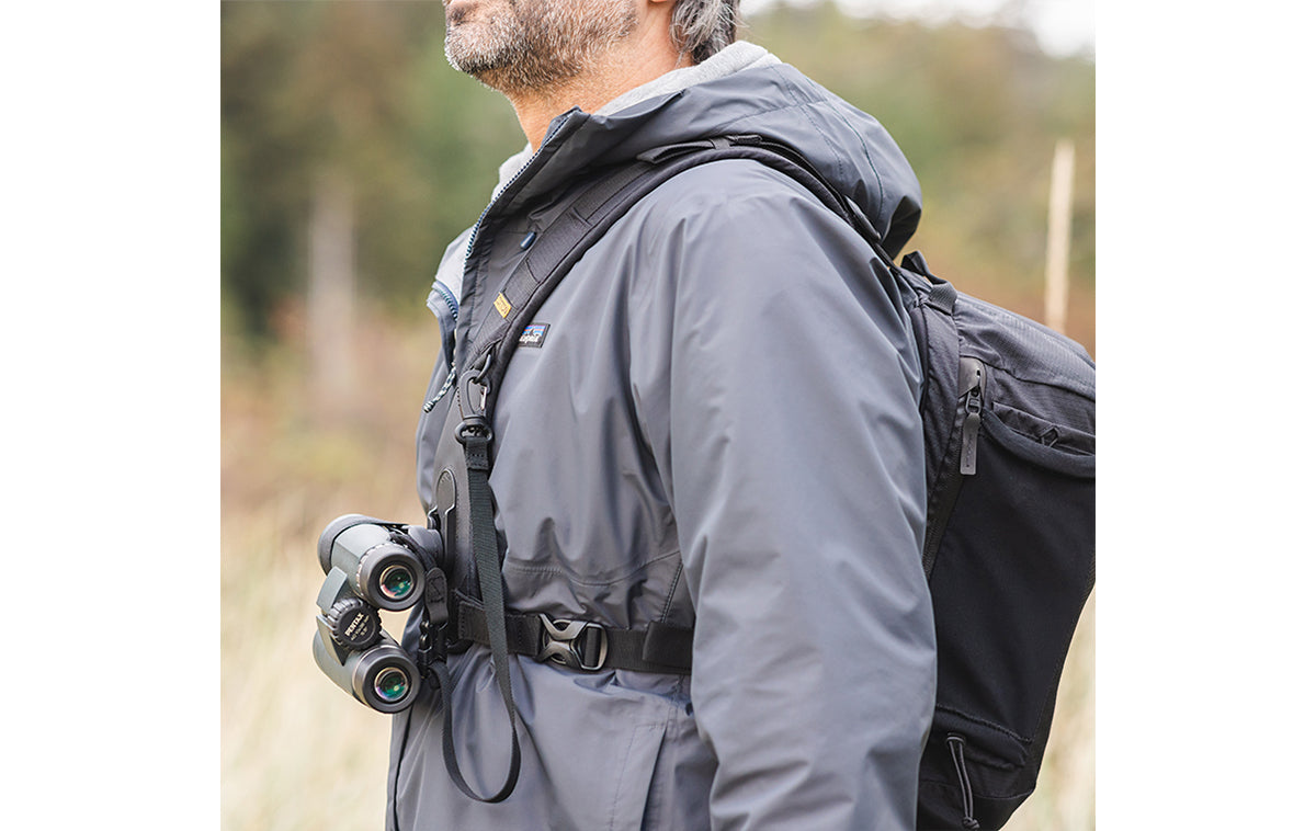 Hyker Slingbag pour les jumelles comprend notre support CCS Everything, une sangle Velcro robuste pour sécuriser le support, ainsi que la sangle d'attache à libération rapide.