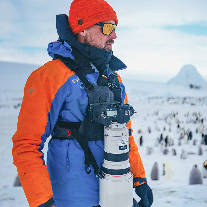 Secure your larger lens via the lens foot on your lens to assure maximum comfort. The harness also fits comfortably under a backpack.